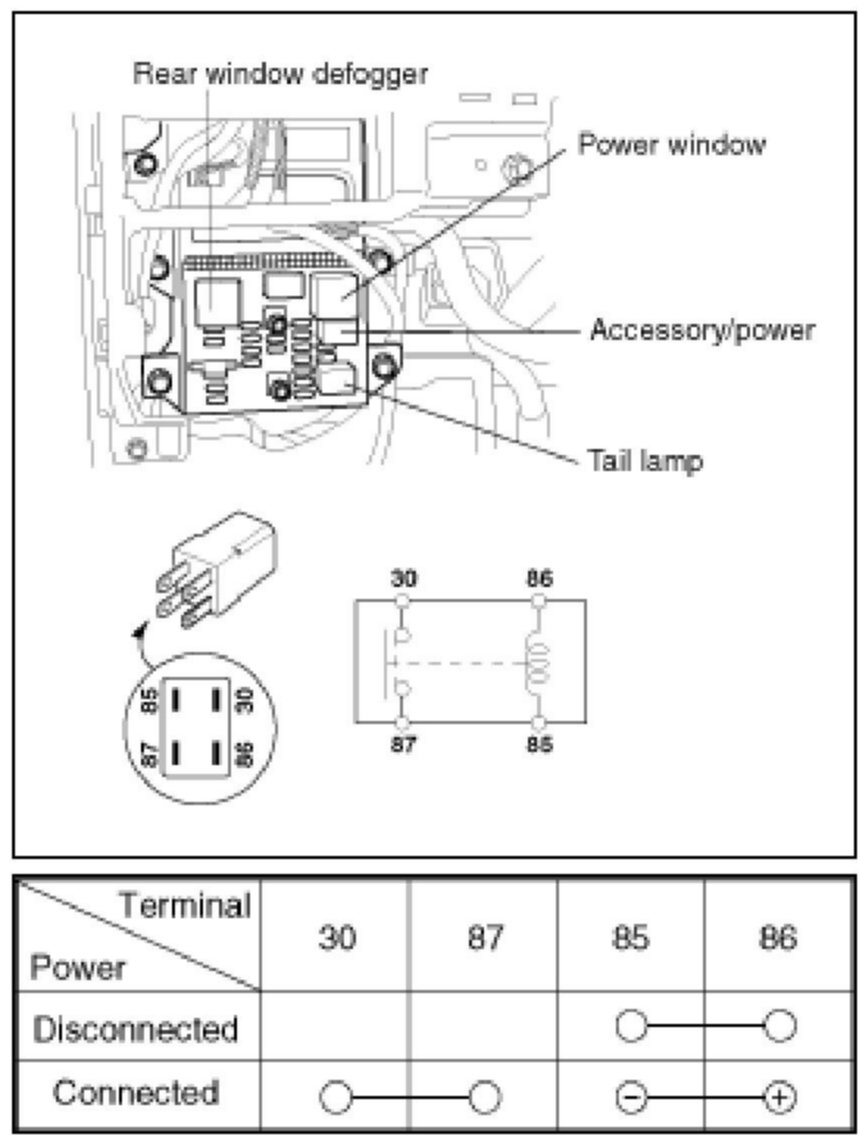 1. There should be continuity between the No.30 and No.87 terminals when power and ground are connected to the No.85 and No.86 terminals.