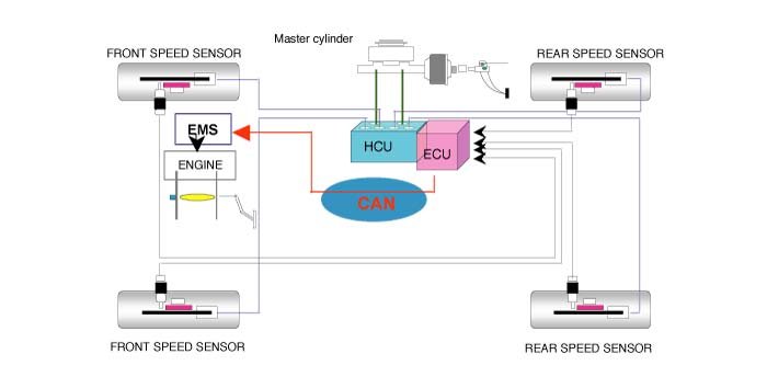 2. HECU will compare signals from front (driving) and rear wheel speed sensors to detect driving wheels slip.