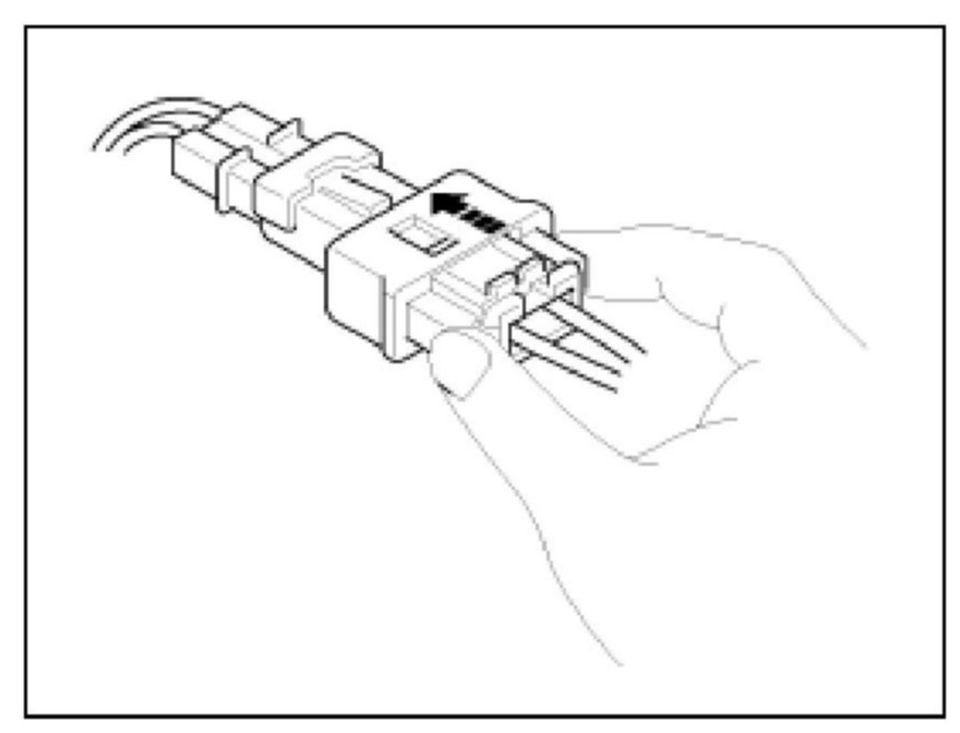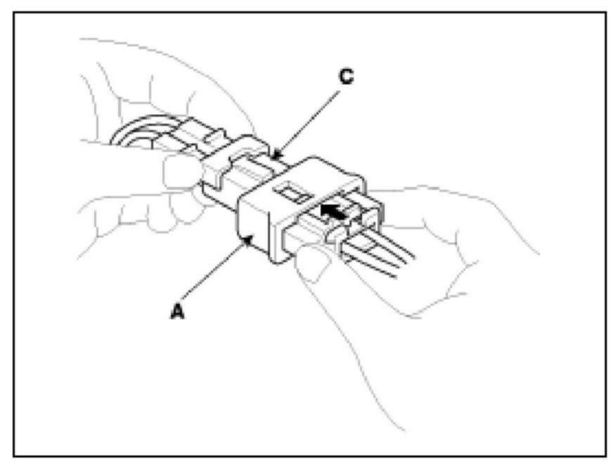1. To reconnect, hold the pawl-side connector half, and press on the back of the sleeve-side connector half in the direction shown. As the two connector halves are pressed together, the sleeve (A) is pushed back by the pawl (C). Do not touch the sleeve.