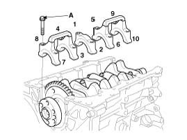 Install and uniformly tighten the 10 bearing cap bolts (A), in several passes, in the sequence shown.
