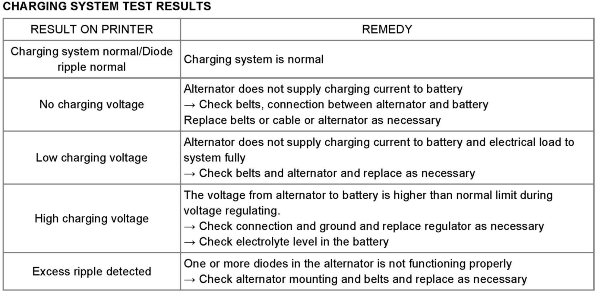 6. Take a relevant action according to the test results by referring to the table after shutting off the engine and disconnect the tester clamps from the battery.