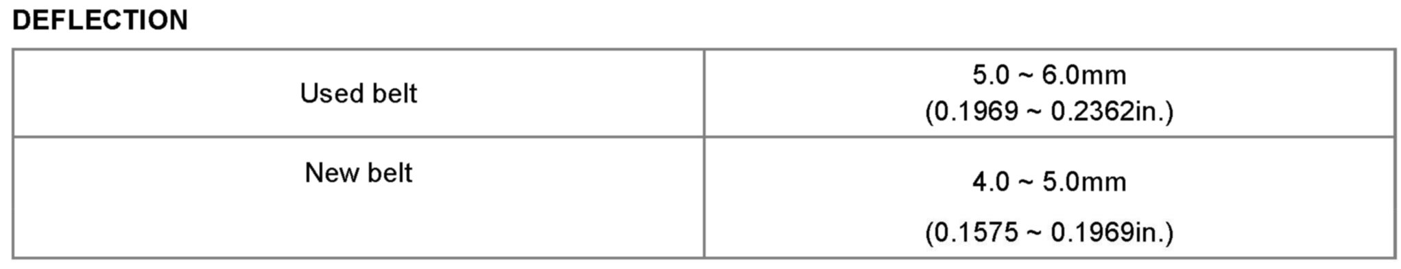 Apply a force of 98 N (10 kg, 22 lb), and measure the deflection between the alternator and the water pump pulley.