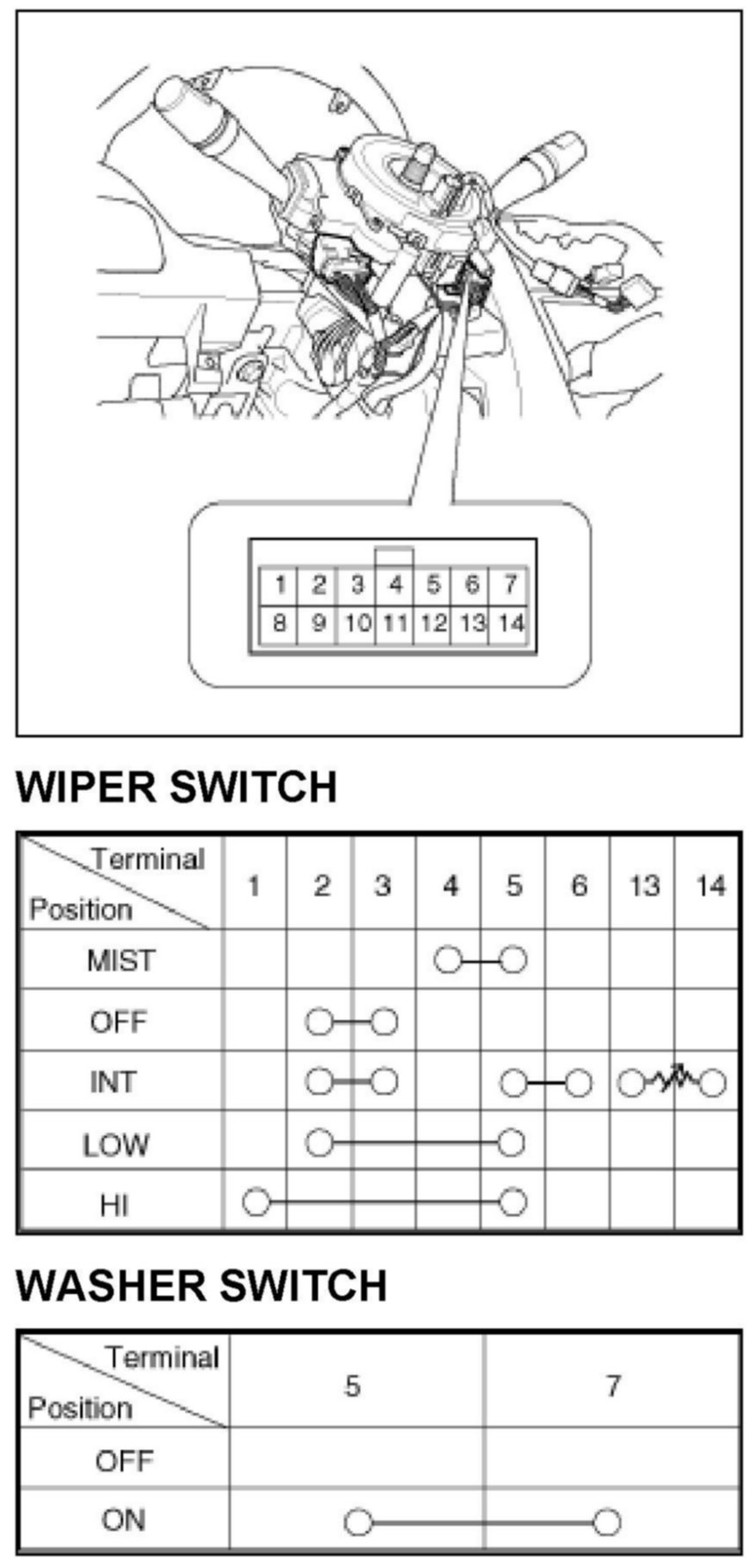 Check for continuity between the terminals while operating the wiper and washer switch.