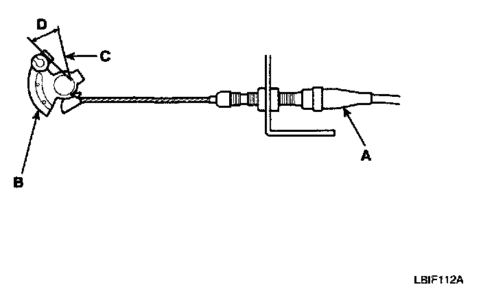 3. Measure the amount of movement of the output linkage (B) until the engine speed starts to increase. At first, the output linkage should be located at the fully closed position (C). The free play (D) should be 3.75 ± 0.5 mm (0.15 ± 0.02 in.)