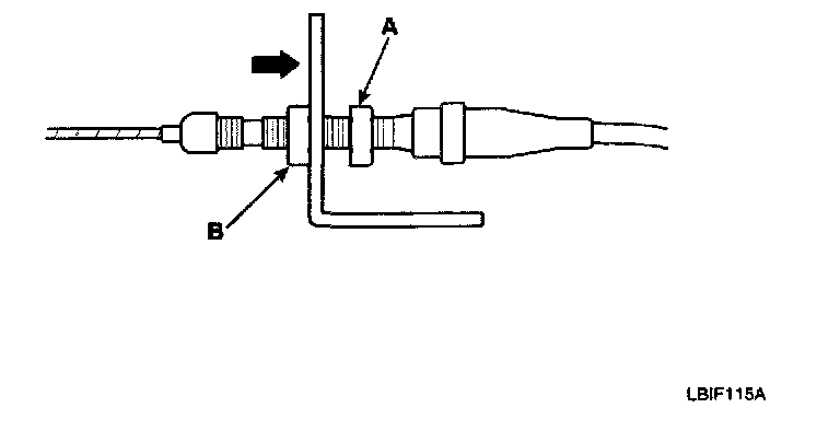 5. Turn the adjusting nut (A) until it is 3.75 ± 0.5 mm (0.15 ± 0.02 in.) away from the bracket (B).
