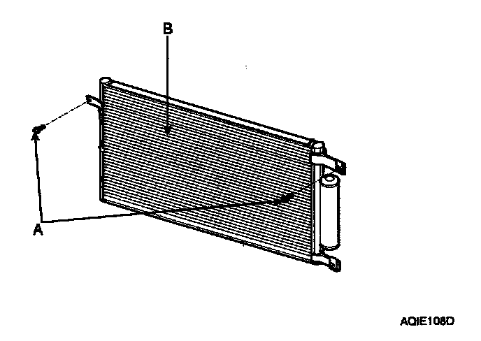 5. Remove the bolts (A), then remove the condenser (B) by lifting it up. Be careful not to damage the radiator and condenser fins when removing the condenser.