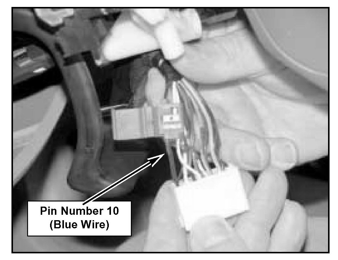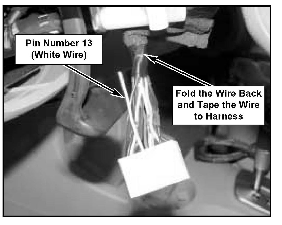 5. Locate Pin Number 13 (white wire), cut this wire 2 inches from the electrical connector. Fold back and tape the harness side of the white wire to the harness, as shown.