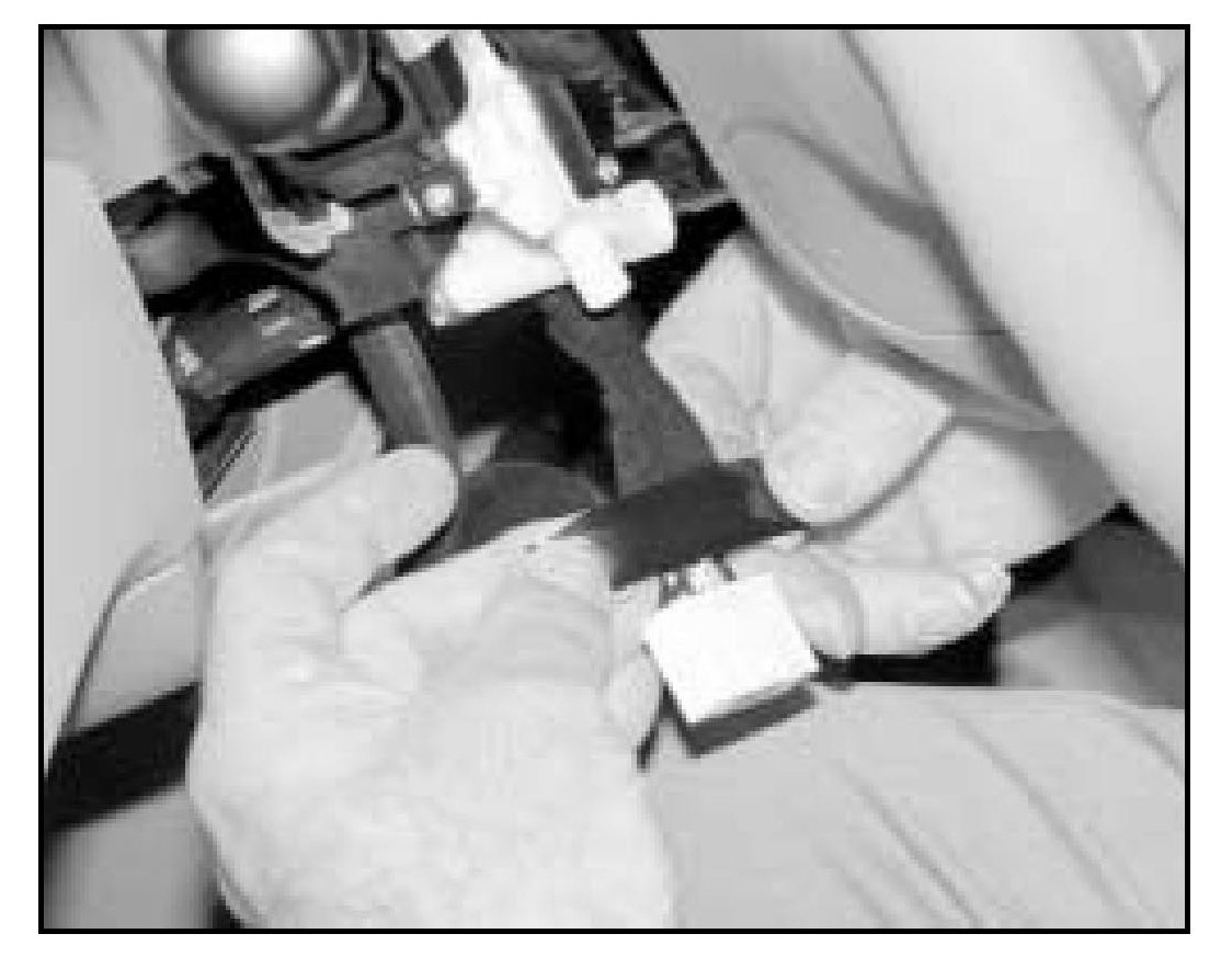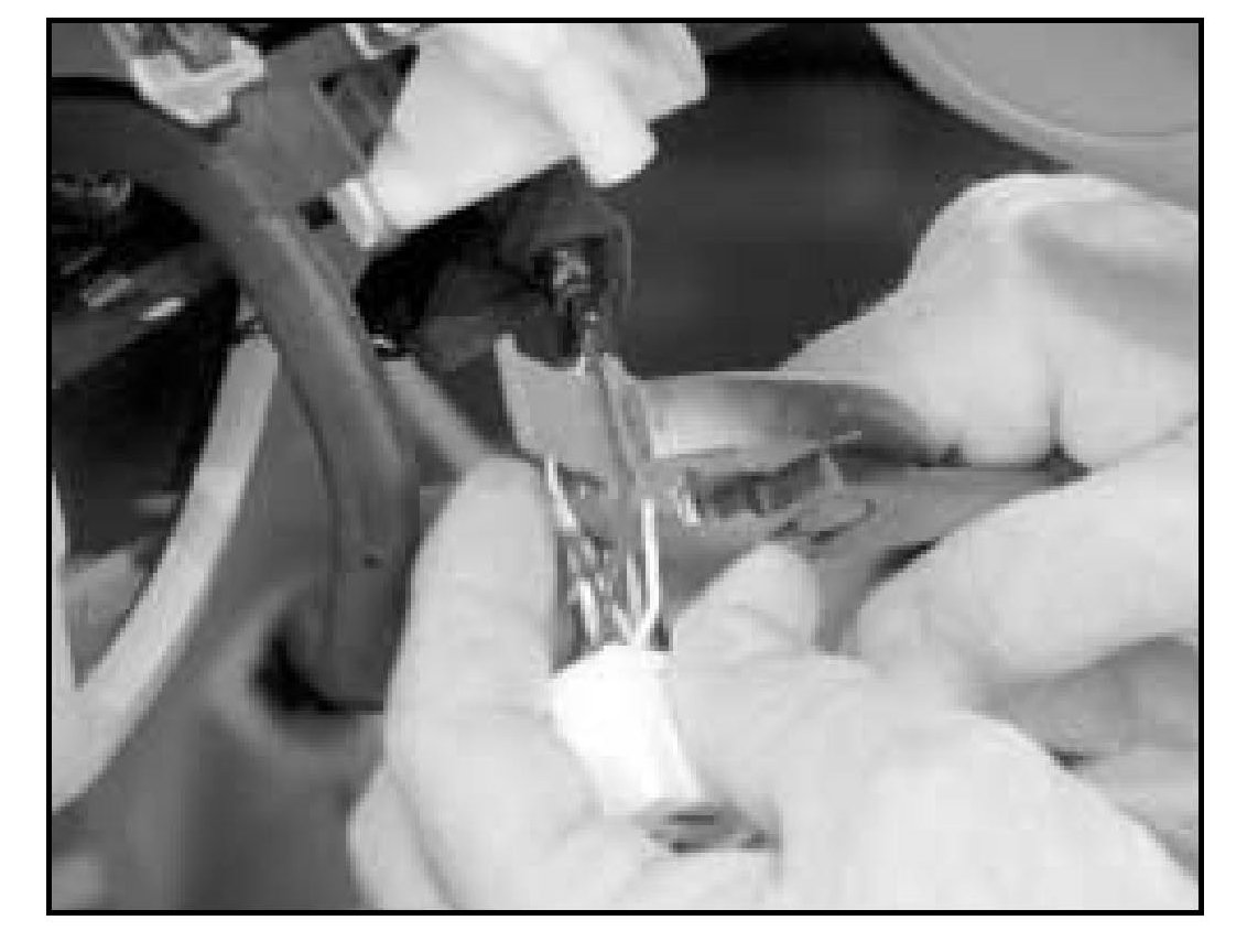 6. Carefully install a 3M Scotch-lok(TM) 558 Electrical Insulation Displacement (EID) Connector over the wire of Pin Number 10 (blue wire, corner location at bottom of connector). Install the white cut wire into the other open cavity of the 3M Scotch-lok(TM) 588 EID Connector.