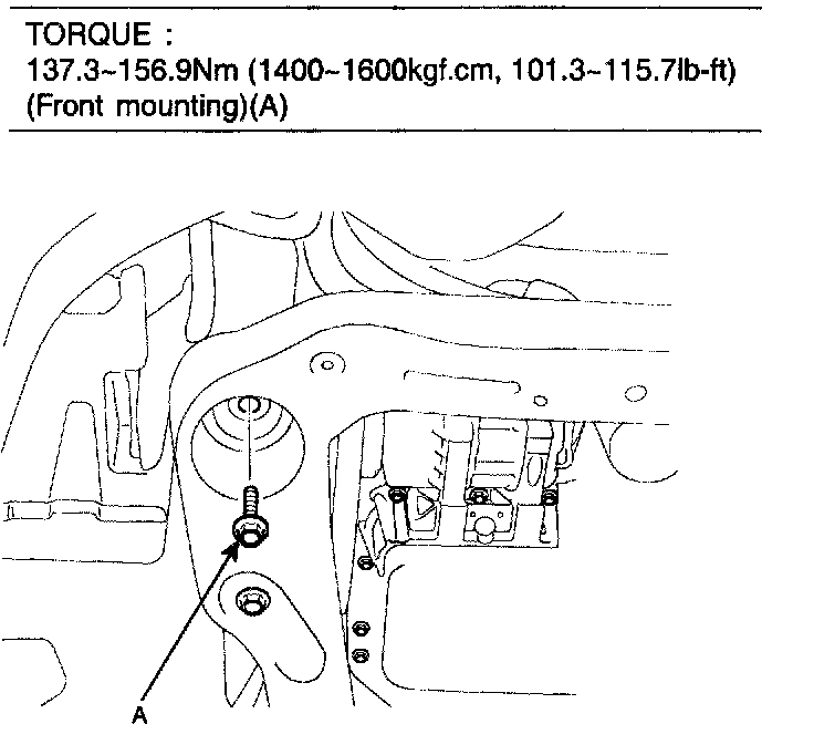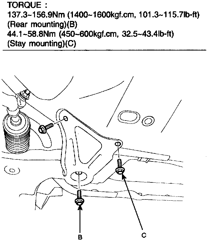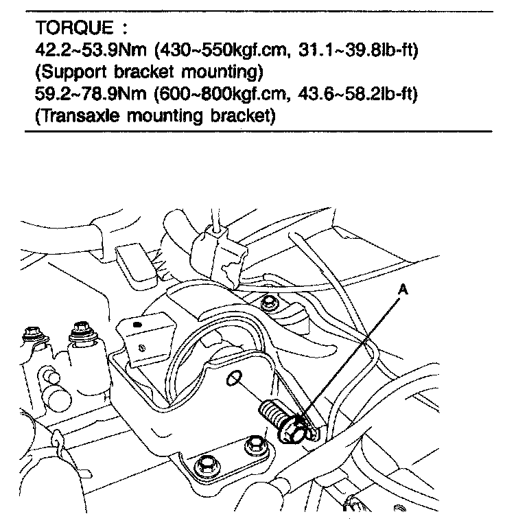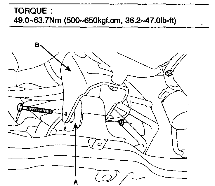 INSTALLATION1. Raising the jack slowly, tighten the transaxle mounting bolts (A) and support bracket mounting bolts (B).
