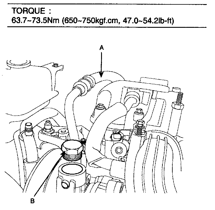 15. After tightening the power steering pressure hose (A) bolt (B), fill the power steering fluid.