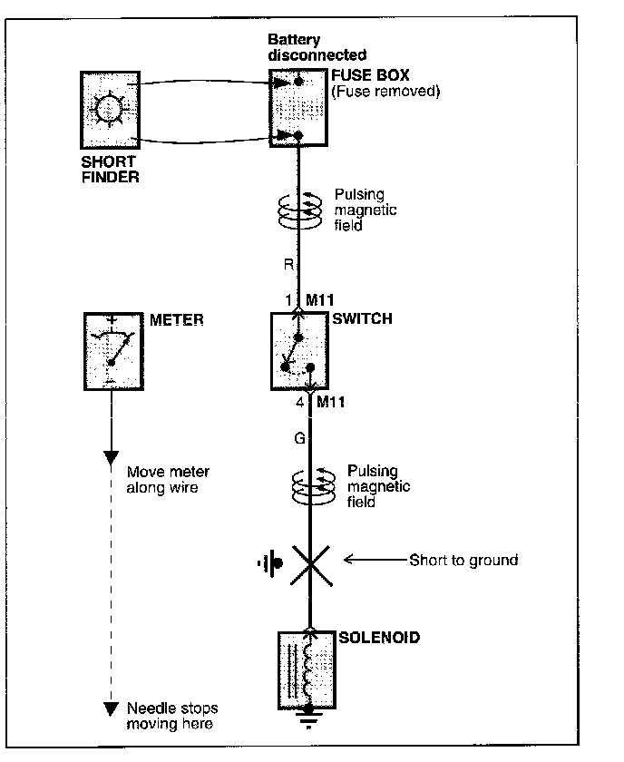 A short finder is available to locate a short to ground. The short finder creates a pulsing magnetic field in the shorted circuit and shows you the location of the short through body trim or sheet metal.