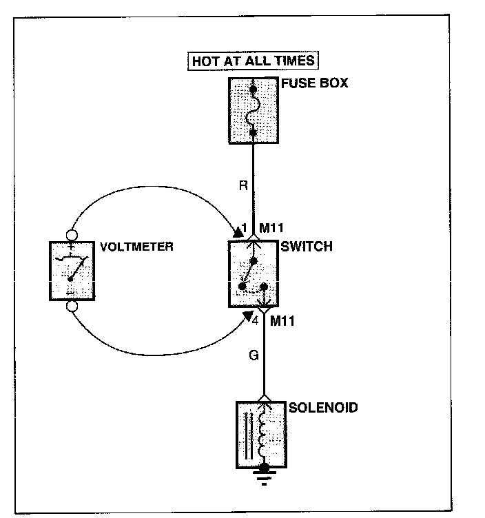 A. Connect one lead of a test lamp or voltmeter to a ground. If you are using a voltmeter, be sure it is the voltmeter's negative test lead you have connected to ground.