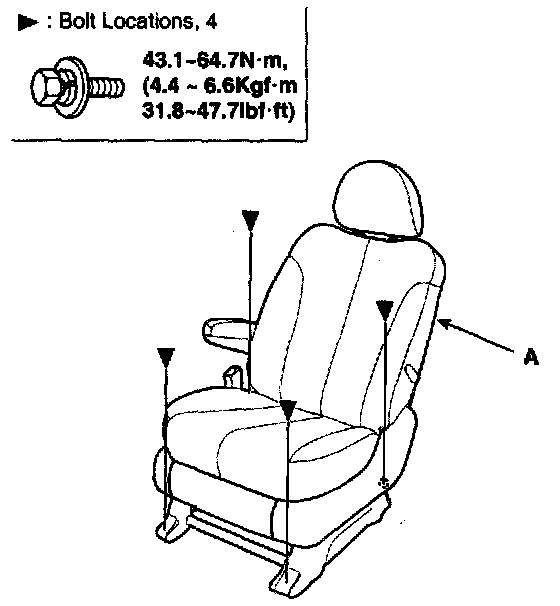 2. After loosening the seat assembly mounting bolts, remove the seat assembly (A).