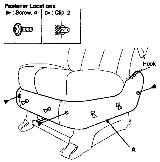 Loosen the recliner mounting screw and clip, then remove the recliner cover (A).