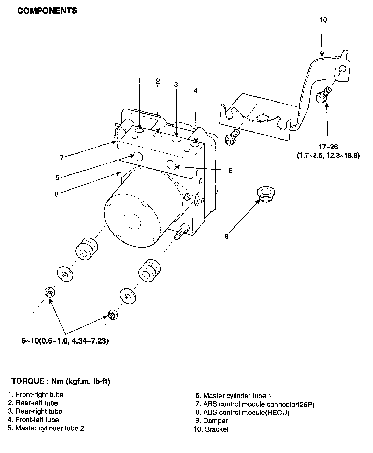HECU bracket mounting bolt: 17 - 26 Nm (1.7 - 2.6 kgf-m, 12.3 - 18.8 ft. lbs.)