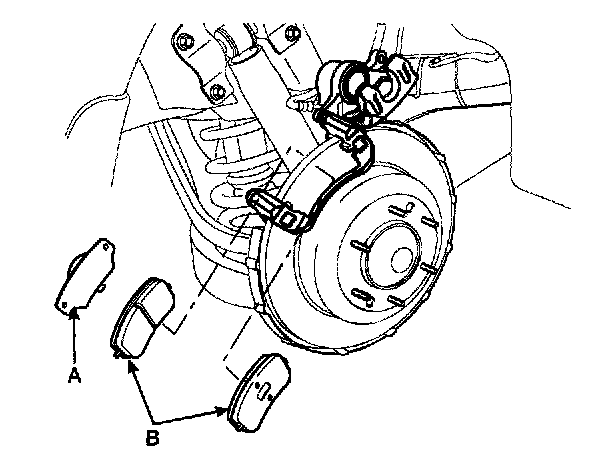 CAUTION: If you reuse the pads, check for foreign material between the pad shim (A) and the back of the pads (B) and reinstall the brake pads in their original position to prevent a momentary loss of braking efficiency.