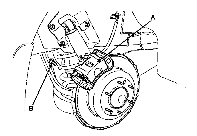 2. Remove the guide rod bolt (B), After raising the caliper assembly (A), support it with a wire.
