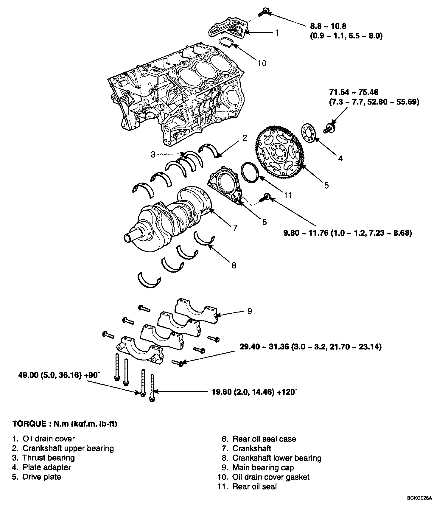10. Remove crankshaft main bearing cap and check oil clearance.