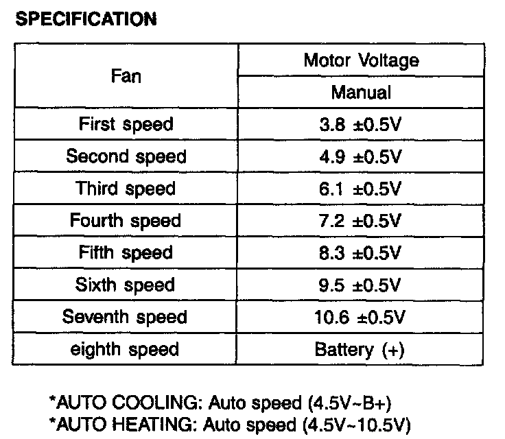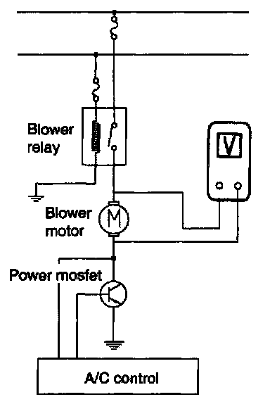 2. Manually operate the control switch and measure the voltage of blower motor between pin 1 and 2.