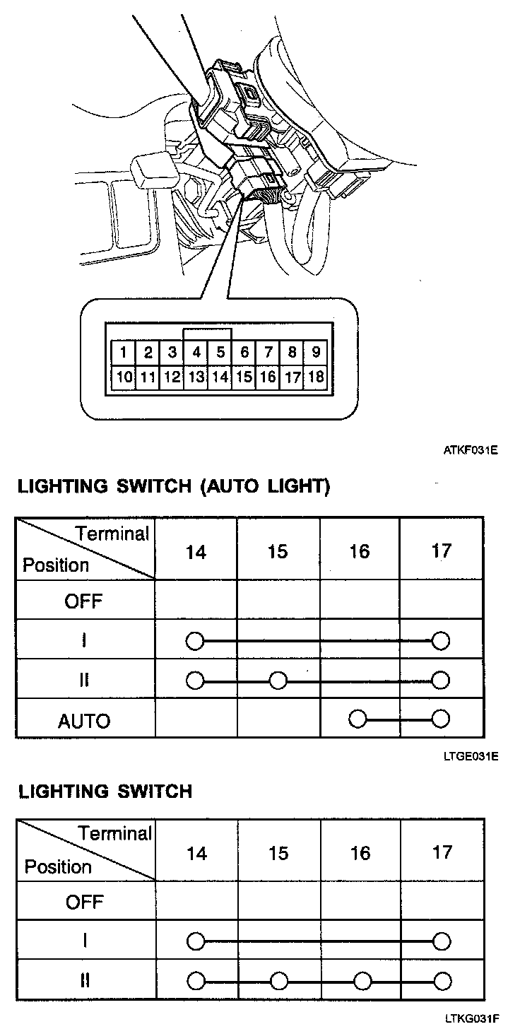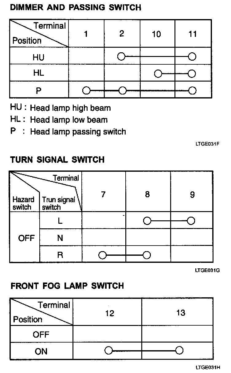 With the multi function switch in each position, make sure that continuity exists between the terminals. If continuity is not as specified, replace the multifunction switch.