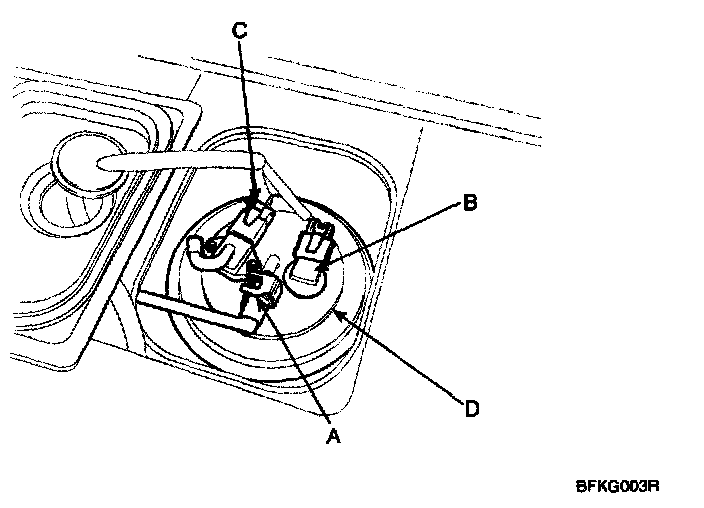 2. After disconnecting the fuel feed quick connector (A), the fuel pump connector (B) and fuel tank pressure sensor connector (C), remove the fuel pump cover (D).