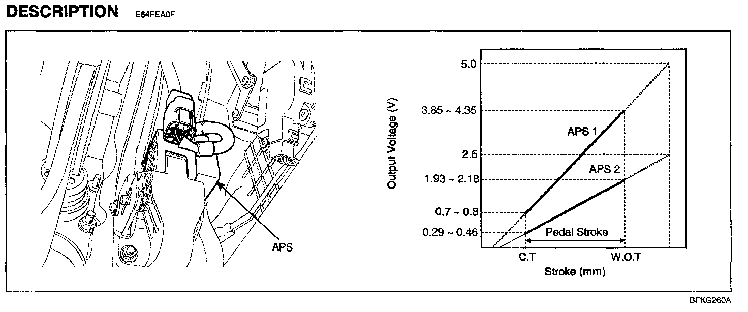 Accelerator Position Sensor (APS) is installed on the accelerator pedal module and detects the rotation angle of the accelerator pedal. The APS is one of the most important sensors in engine control system, so it consists of the two sensors which adapt individual sensor power and ground line. The second sensor monitors the first sensor and its output voltage is half of the first one. If the ratio of the sensor 1 and 2 is out of the range (approximately 1/2), the diagnostic system judges that a malfunction has occurred.