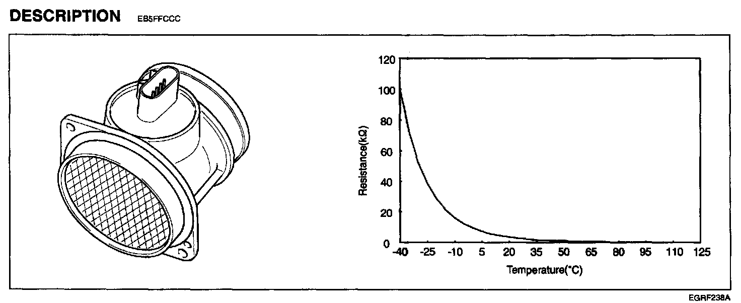Intake Air Temperature Sensor (IATS) is installed inside the Mass Air Flow Sensor (MAFS) and detects the intake air temperature. To calculate precise air quantity, correction of the air temperature is needed because air density varies according to the temperature. So the PCM uses not only MAFS signal but also IATS signal. This sensor has a Negative Temperature Coefficient (NTC) and its resistance is in inverse proportion to the temperature.