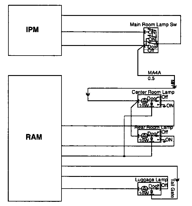 1. The room lamps are can be controlled manually using the 3-state (ON, DOOR, OFF) switch or by the Rear Area Module (RAM). A main switch, located to the left of the steering wheel, is used as a master control switch. The operating logic of the lamps will vary based on the position of the main switch ON, DOOR, or OFF).