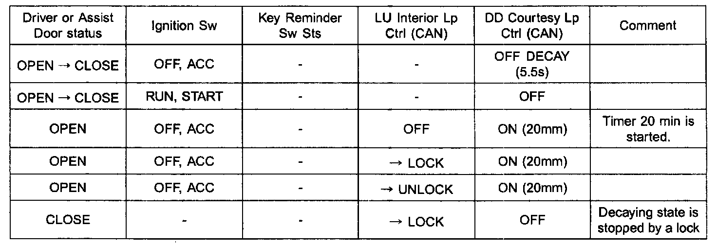 - If the status of driver door (assist door) changes from OPEN to CLOSE when ignition switch is RUN position, Driver courtesy lamp should turn off immediately.