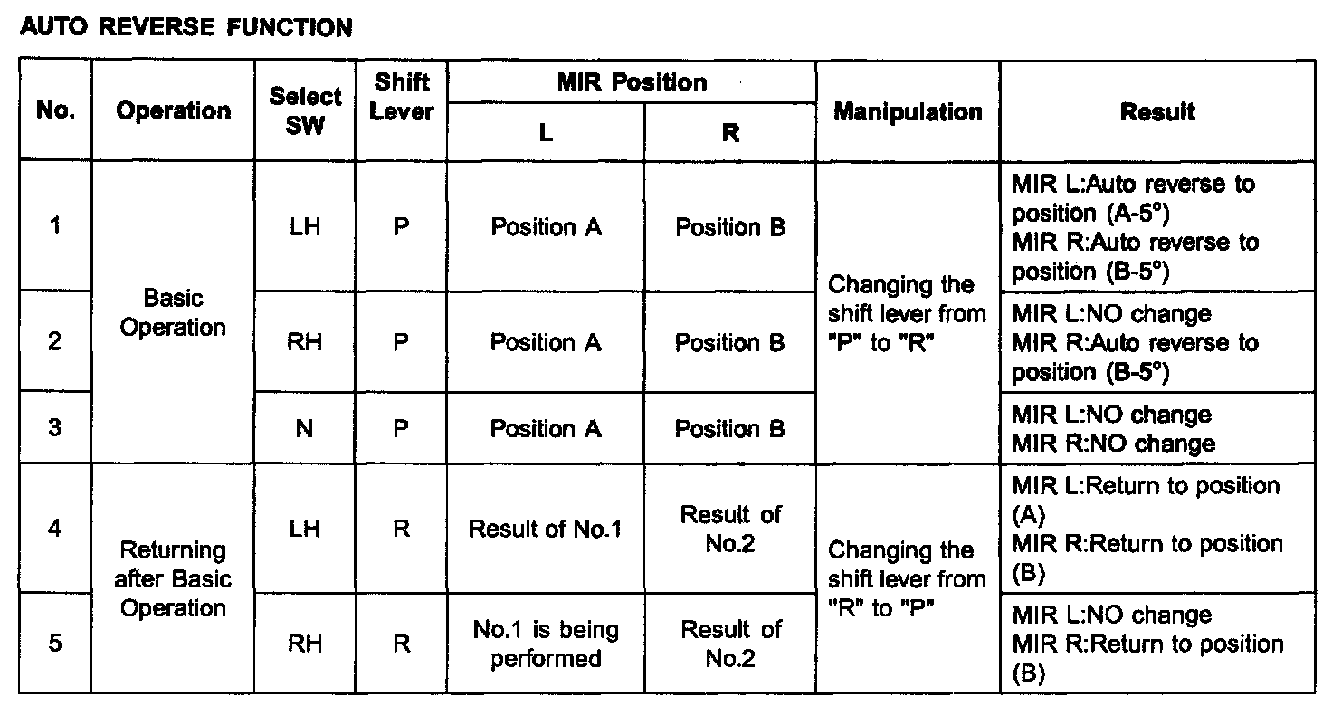 2. The mirror operation signal cannot be displayed into the same direction for more than 15 seconds. (When the mirror is replacing to the saved position or the switch is manually pressed)