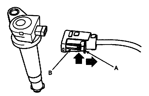 NOTE: When removing the ignition coil connector, pull the lock pin (A) and push the clip (B).