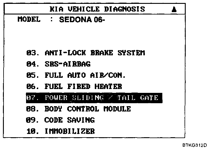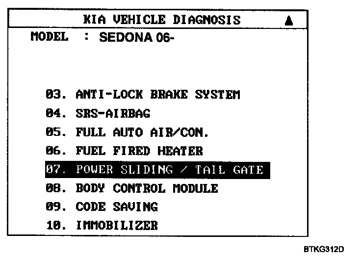 2. When checking the optical sensor, select a vehicle type and "POWER SLIDING/TAILGATE" menu.