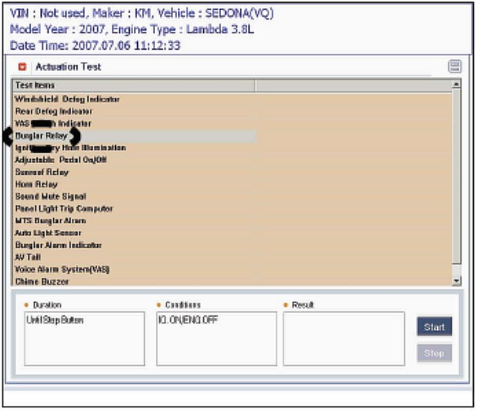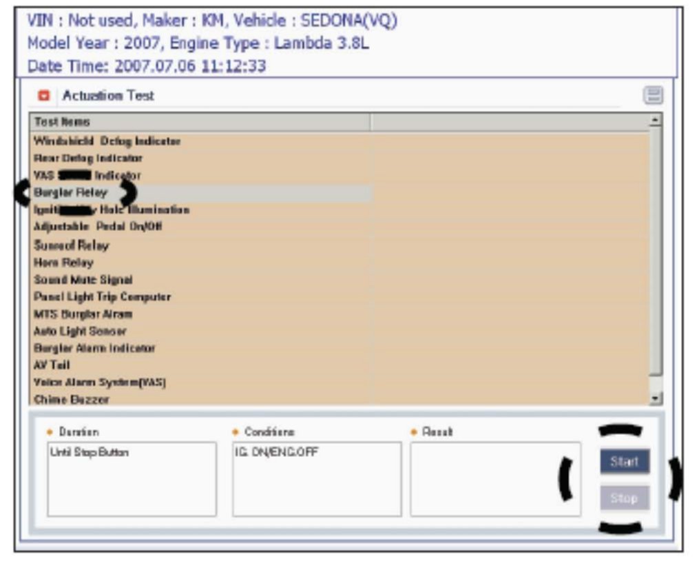 12. Once again, have an assistant HOLD the ignition key in the START (crank) position. Now open and close the Burglar Relay contacts by choosing start and then stop on the GGS screen, while the key is held in the START position. Repeat this several times recording the EXACT voltage drop each time STOP is selected.