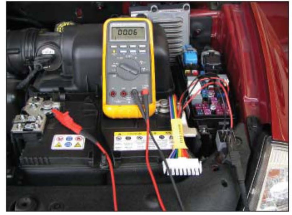 8. Connect (clip) the DVOM positive (red) lead to the battery positive terminal. The DVOM should now read battery voltage.