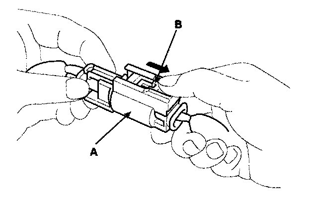 To release the lock, pull the spring-loaded sleeve (A) and the slider (B), while holding the opposite half of the connector. Pull the connector halves apart. Be sure to pull on the sleeve and not on the connector half.