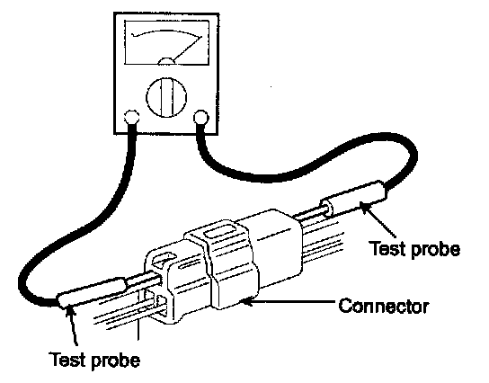 11. When using a circuit tester to check continuity or voltage on connector terminals, insert the test probe into the harness side. If the connector is a sealed connector, insert the test probe through the hole in the rubber cap until contacts the terminal, being careful not to damage the insulation of the wires.