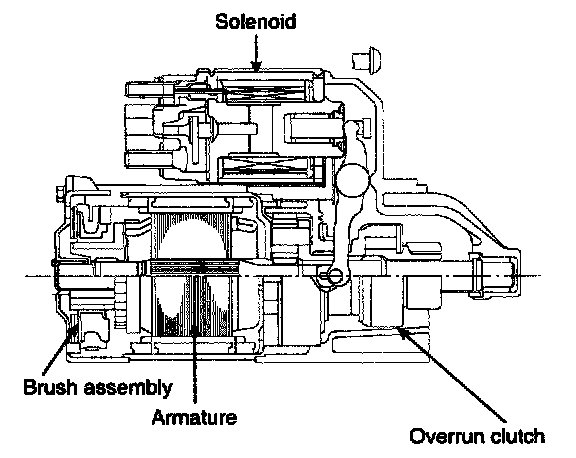 The contacts close and the starter motor cranks. In order to prevent damage caused by excessive rotation of the starter armature when the engine starts, the clutch pinion gear overruns.