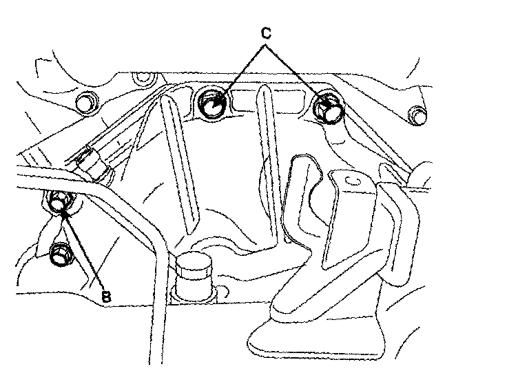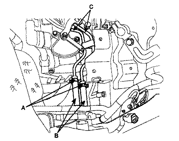 17. Connect the transaxle oil cooler hoses (A) to the tubes (C) by fastening the clamps (B).