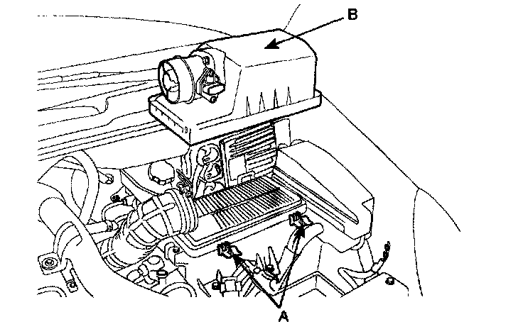 23. Install the air cleaner upper cover (B) by fastening the clips (A).