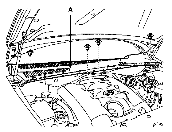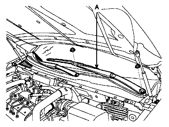 2. Remove the weather strip and the cowl top cover (A) after removing 4 fasteners.