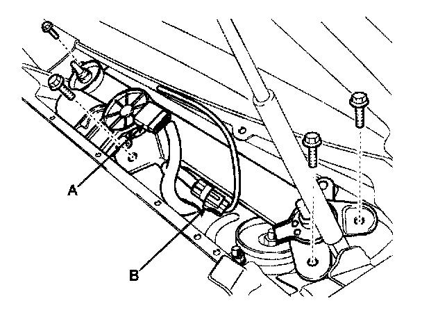 3. Remove the windshield wiper motor and linkage assembly after removing 4 bolts. Disconnect the wiper motor connector (A) and windshield deicer connector (B) from the wiper motor & linkage assembly.