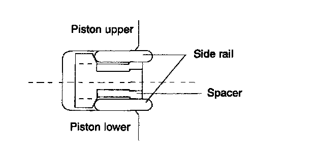 2. Install the upper side rail. To install the side rail, first put one end of the side rail between the piston ring groove and spacer, hold it firmly, and press down with finger on the portion to be inserted into the groove (as illustrated).