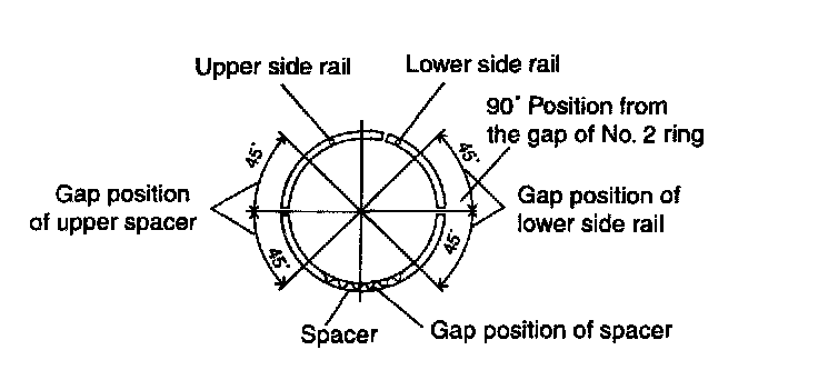 7. Position each piston ring end gap as far away from its neighboring gaps as possible. Make sure that the gaps are not positioned in the thrust and pin directions.