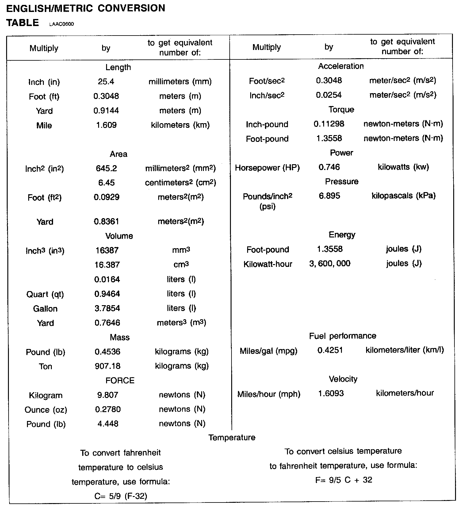 English/Metric Conversion Table