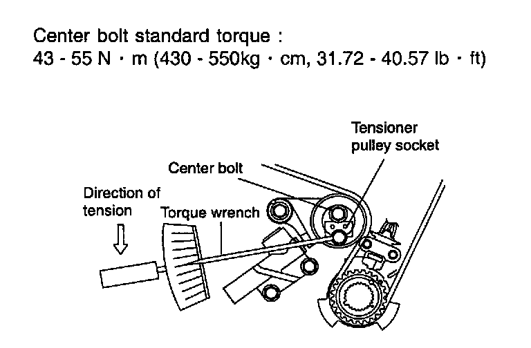 Then, loosen the center bolt and give the belt 50 kg-cm of tension with tensioner pulley socket (Two pins are attached) and torque wrench. While maintaining this state, tighten the center bolt to the standard torque.