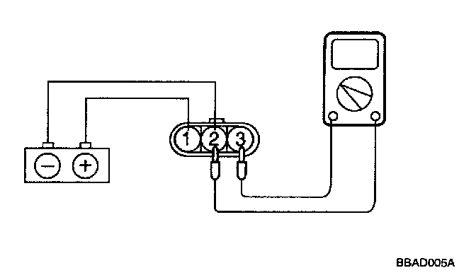 Connect the negative (-) terminal of a 3 V power supply to terminal 2 of the power transistor; then check whether there is continuity between terminal 3 and terminal 2 when terminal 1 and the positive (+) terminal are connected and disconnected.