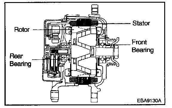GENERAL INFORMATIONThe charging system included a battery, an generator with a built-in regulator, and the charging indicator light and wire. The generator has eleven built-in diodes (four positive, four negative and three exiter diodes), each rectifying AC current to DC current. Therefore, DC current appears at generator "B" terminal.