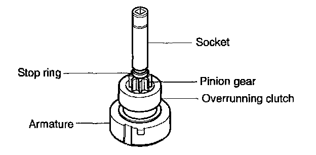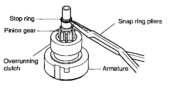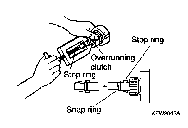 2. After removing the snap ring (using snap-ring pliers), remove the stop ring and the overrunning clutch.