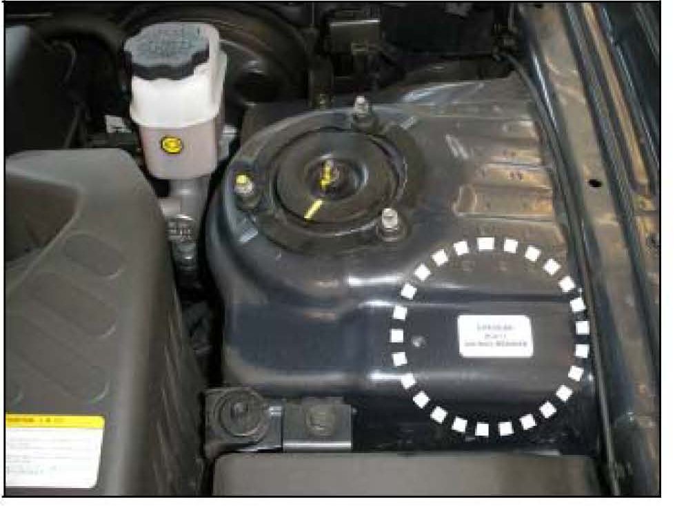Attach campaign completion sticker SC077 to the driver's side strut tower as shown here.
