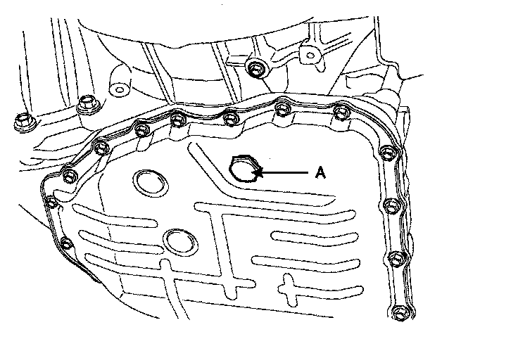 3. Remove the drain plug (A) from the bottom of the transmission case to drain the fluid.